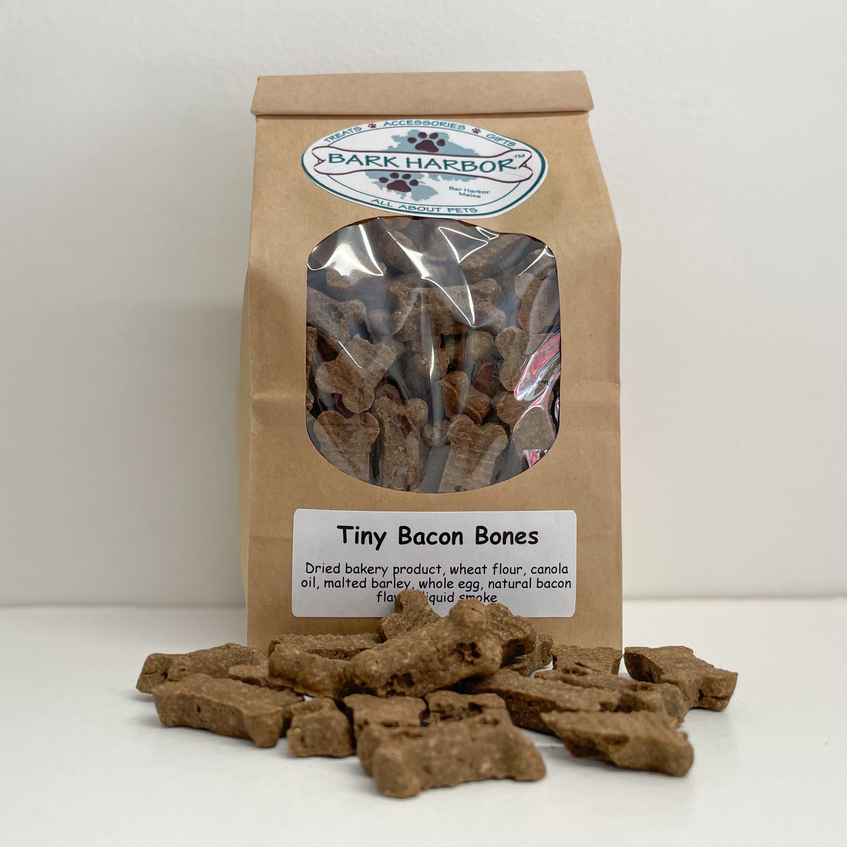 Ingredients: Dried bakery product, wheat flour, canola oil, malted barley, natural bacon flavor, whole egg, liquid smoke.